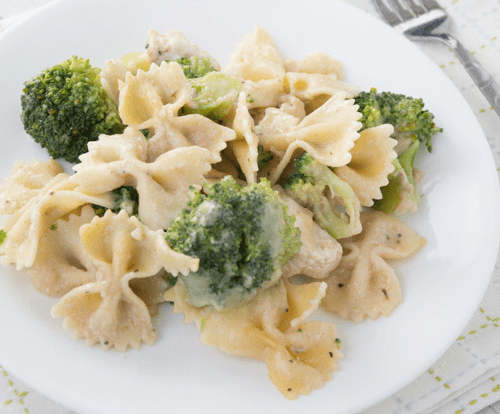 This tasty casserole can be made entirely in one skillet and takes only 20 minutes to cook. Pasta is topped with protein-packed chicken, filling broccoli, and homemade cream sauce for a filling and satisfying dish.
