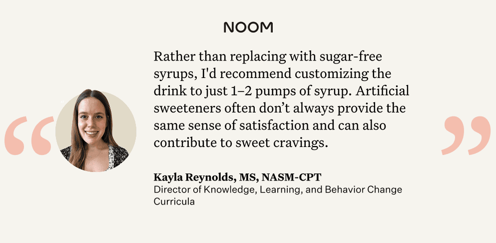 You can cut down on the total sugar and calories by selecting drinks made with sugar-free syrups, but Reynolds doesn’t suggest it: “Rather than replacing with sugar-free syrups, I’d recommend customizing the drink to just 1 to 2 pumps of syrup. Then, you can add flavorful spices like cinnamon and nutmeg at the counter. That way, you’re actually cutting down on sugar instead of swapping it for artificial sweeteners, which often don’t always provide the same sense of satisfaction and can also contribute to sweet cravings. Over time, this can help retrain your taste buds to enjoy less sweetness while still keeping your drink enjoyable.”