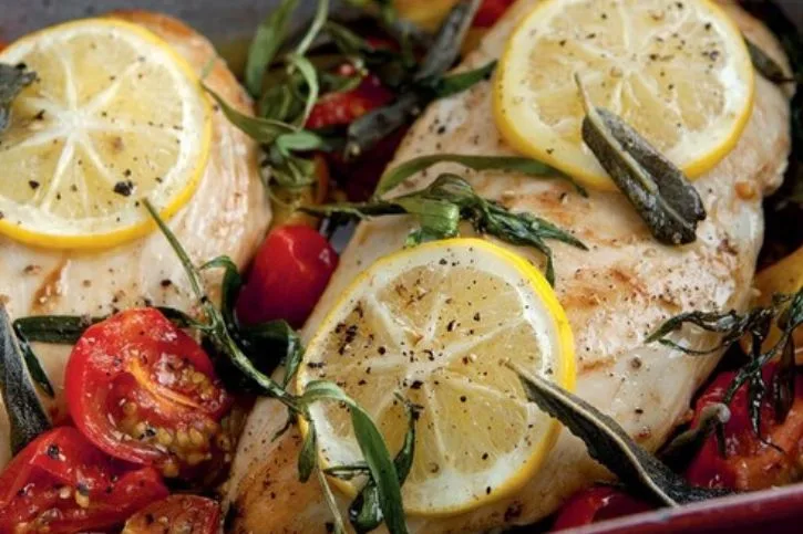 - Top each chicken breast with 2 lemon slices. Scatter the tarragon and sage over and around the chicken, then drizzle the remaining 2 teaspoons of olive oil over the herbs.