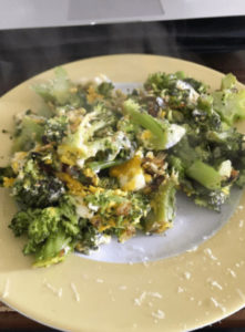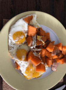 Falls die Möglichkeit besteht zum Kochen, könnt ihr euch Spiegeleier + Lieblingsgemüse zubereiten. Hier seht ihr Süßkaroffeln und Brokkoli als Beispiele. In 5-10 Min fertig!