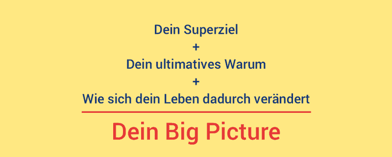 Hier beginnt alles. Dein Großes Bild, die grandiose Vision deiner zukünftigen Selbst, die du im Sinn hast. Was genau du diese Vision nennst, ist gar nicht so wichtig. Wichtig ist jedoch, dass du dich für ein Gesamtziel entschieden hast, mit dem du dich motiviert, inspiriert und aufgeregt fühlst – unabhängig davon, auf wie viele Hindernisse du unterwegs stoßen wirst. Wenn du dein Gesamtziel zusammenstellst, denke dir … „Wie wird mein Leben anders sein, wenn ich dieses Ziel erreiche?“