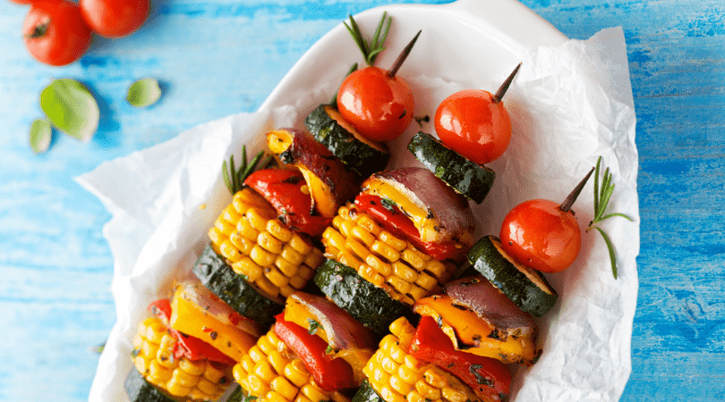 - Cortar la mazorca de maíz en 4 partes; el calabacín/zucchini en rodajas de 1.5 cm aproximadamente; y el pimentón y la cebolla en tiras cuadradas/rectangulares.
