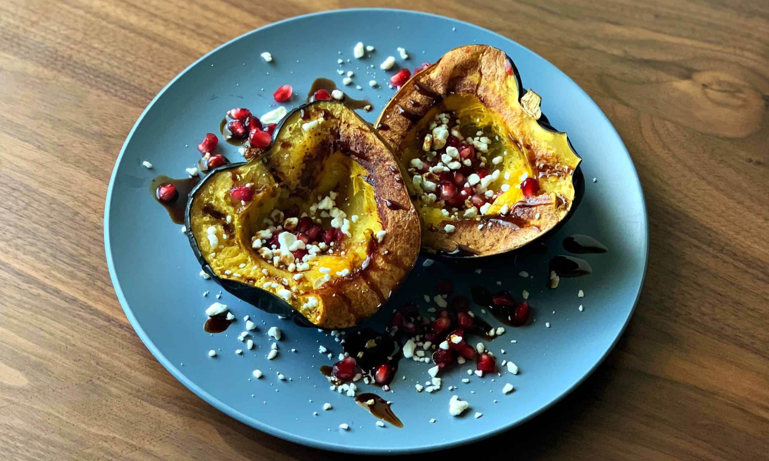 - Emplata y añade el queso de cabra, la granada y el vinagre balsámico.