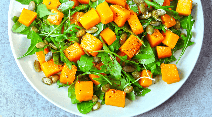 - Mezclar en un bol la rúcula, la calabaza, las semillas y las dos cucharadas de aceite de oliva.