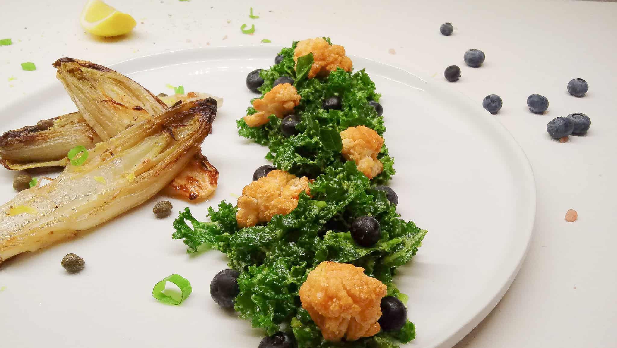 5. Servir la col rizada con los floretes de la coliflor y arándanos. Al costado colocar las endivias, ponerle jugo y ralladura de limón. Decorar con alcaparras y cebollín (cebolla de verdeo) al gusto.
