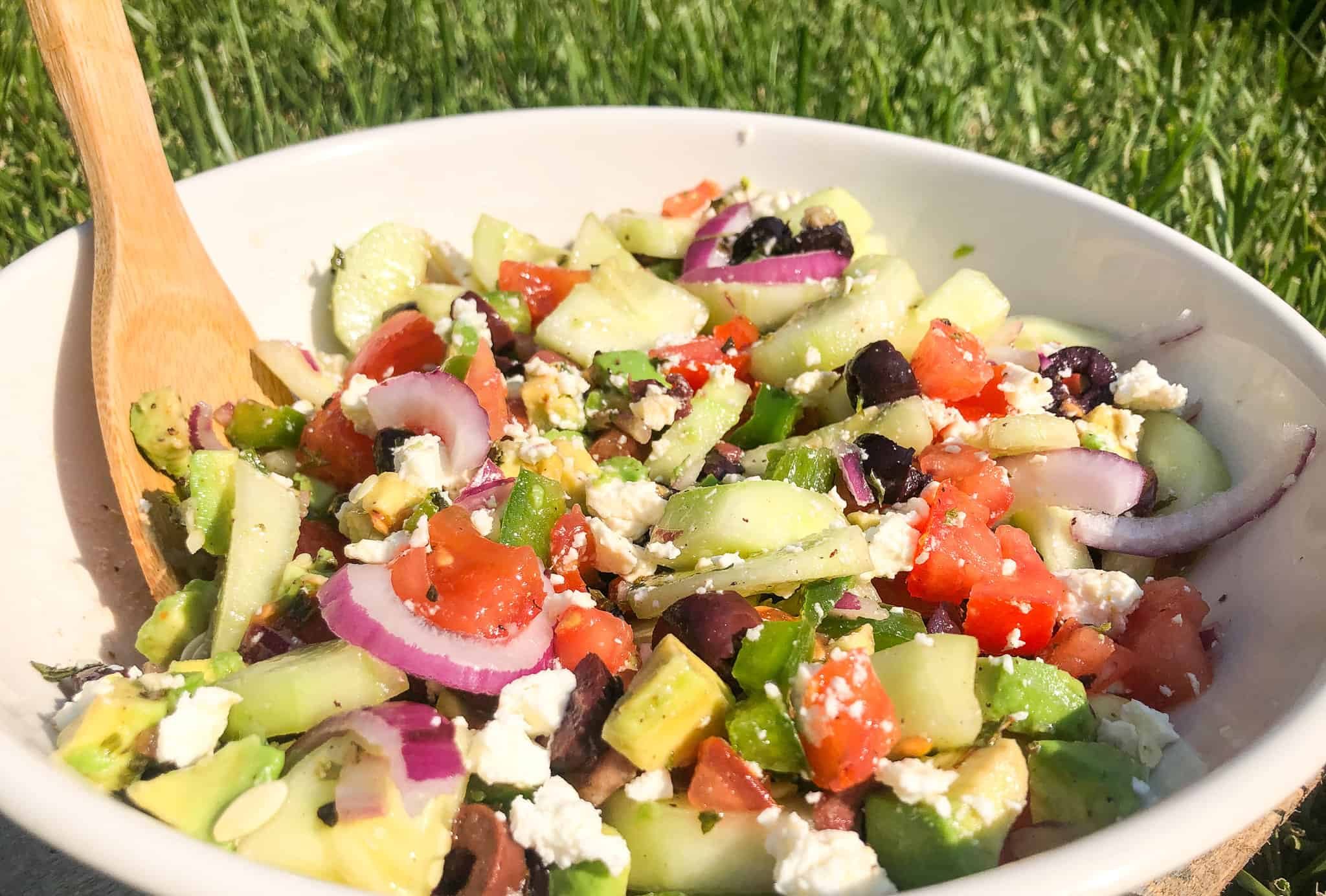 - Agregar tomates, pepinos, cebolla, pimientos verdes, aceitunas, aguacate (palta) y queso a un tazón para ensaladas.
