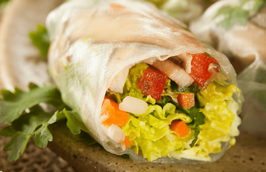 - Sumergir las hojas de arroz en agua a temperatura ambiente, por algunos segundos hasta hidratarlas, cuidando que no se quiebren.