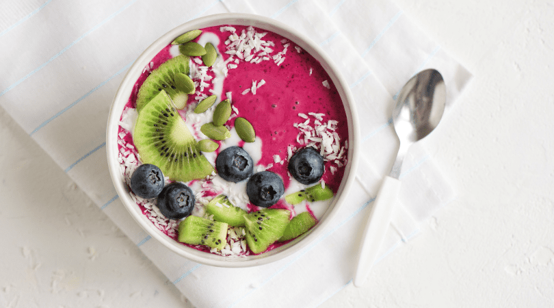 - Servir la mezcla en un tazón, decorar con el kiwi picado, los arándanos y el coco rallado.