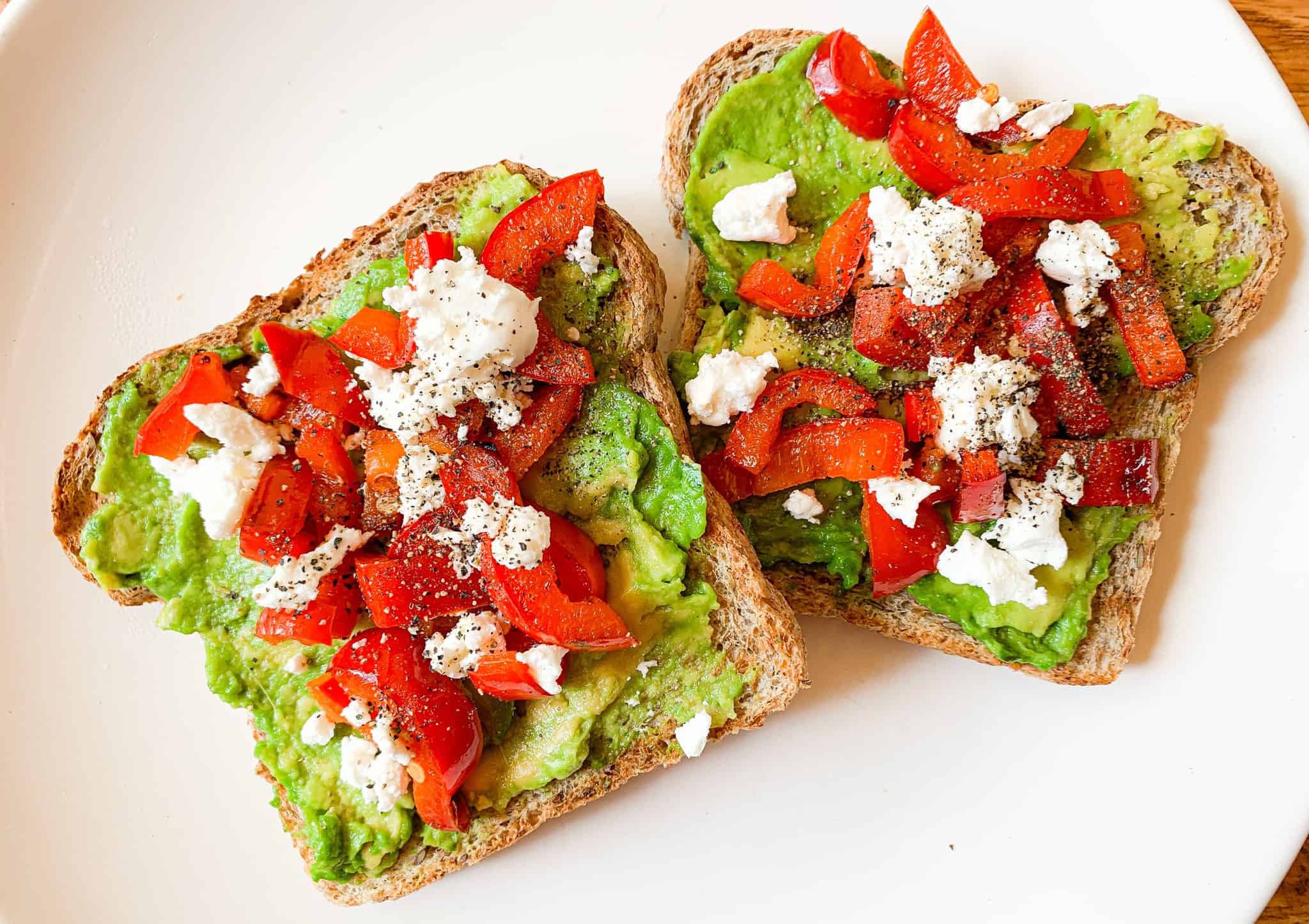 - Una vez el pan esté tostado, untar aguacate/palta, agregar los pimientos asados, el queso de cabra y sazonar con pimienta al gusto.
