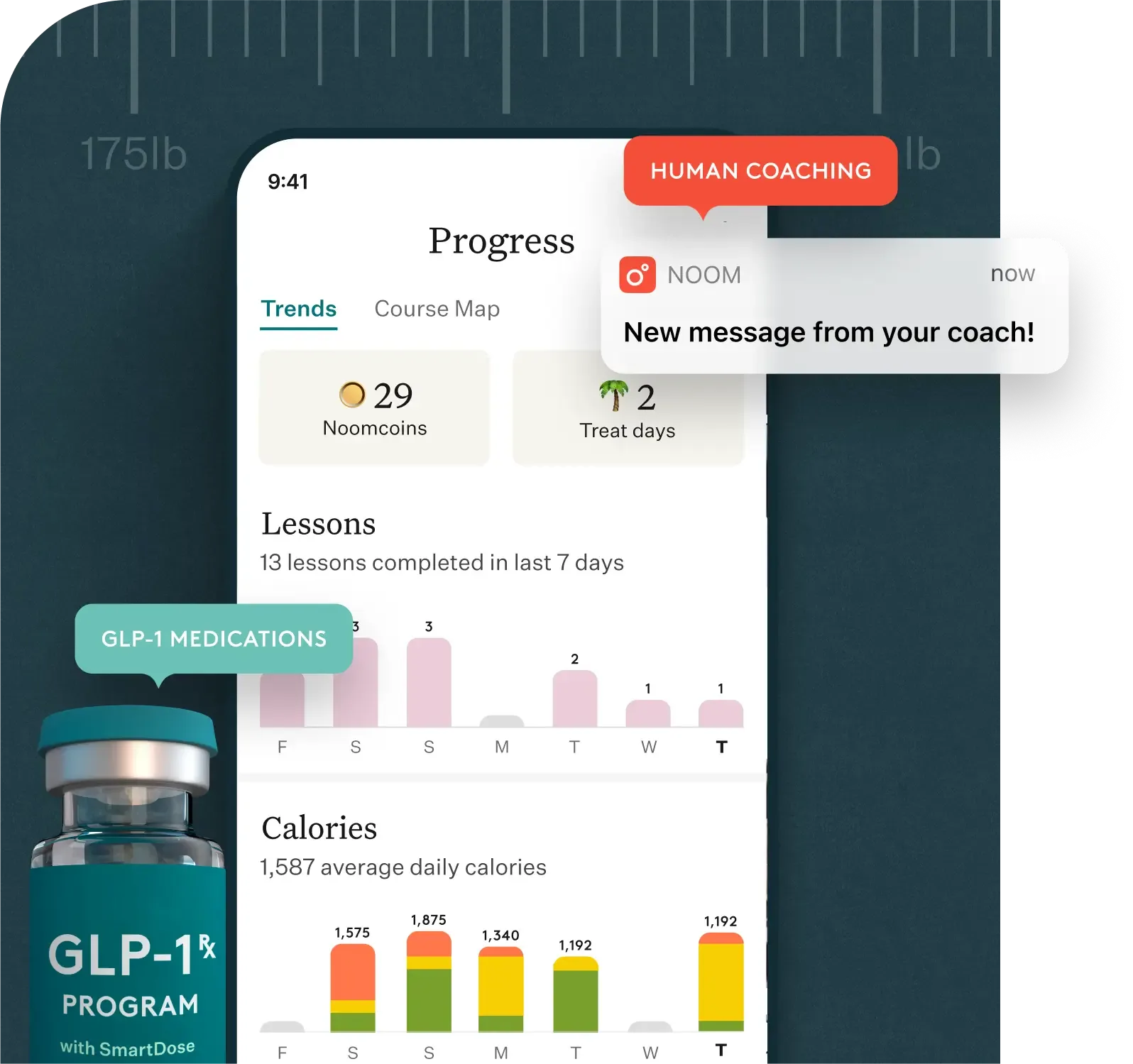 Weight-loss medications can produce exceptional results, but meds alone aren’t enough. Your patients will also get access to our powerful weight-loss platform—featuring daily, bite-sized lessons, human coaching with AI insights, and a supportive community of Noomers just like them. Noom will also help track their daily activity levels, caloric intake, weight, and more to help them reach their goals.