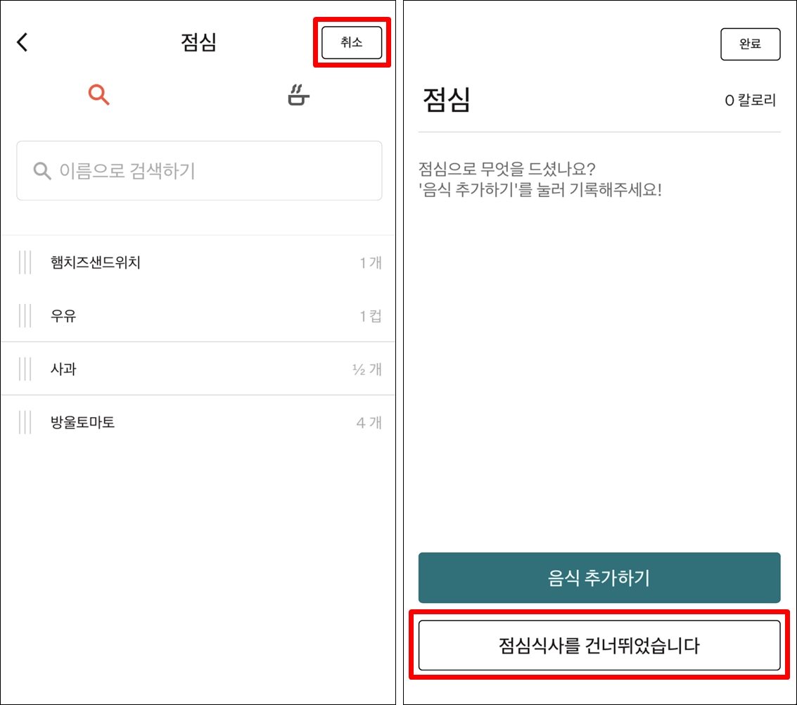 식사를 건너뛰었을 경우, 두 가지 방법으로 식사기록을 생략할 수 있습니다.