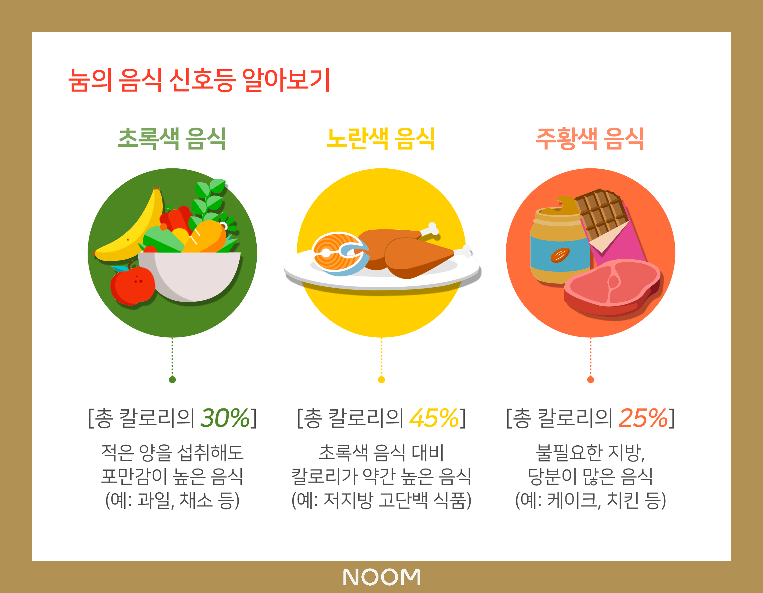 눔은 회원님이 건강한 식단을 구성하실 수 있도록 ‘음식 신호등’을 만들어 칼로리 밀도에 따라 음식을 구분하고 있어요.
