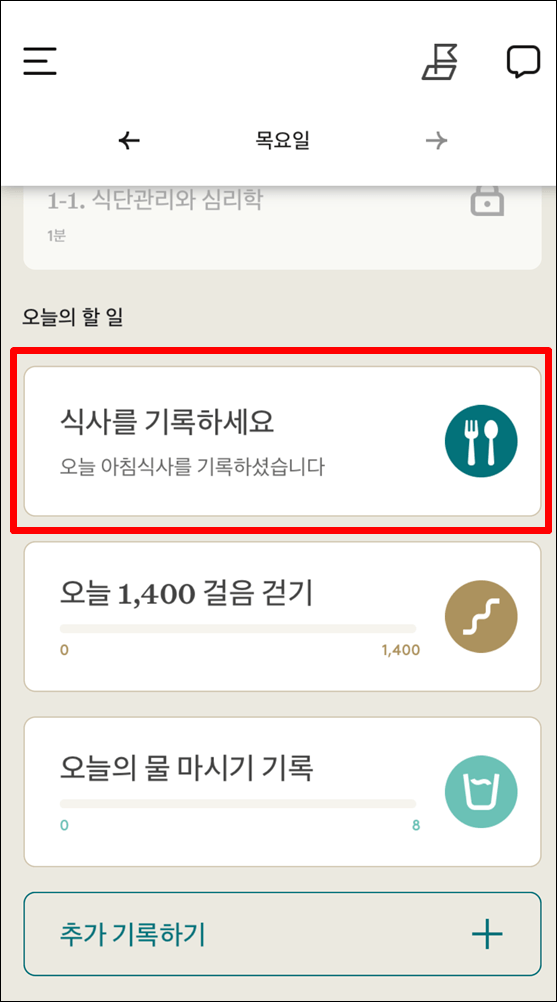 1. 눔 앱 메인 화면 식사를 기록하세요 카드 누르기