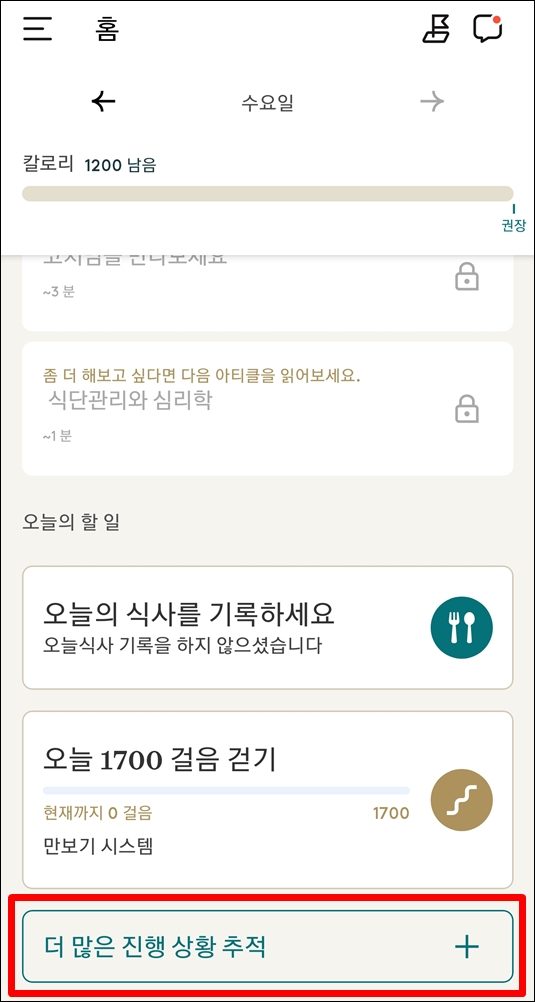 1. 눔 앱 홈 화면 하단의 더 많은 진행상황 추적 클릭