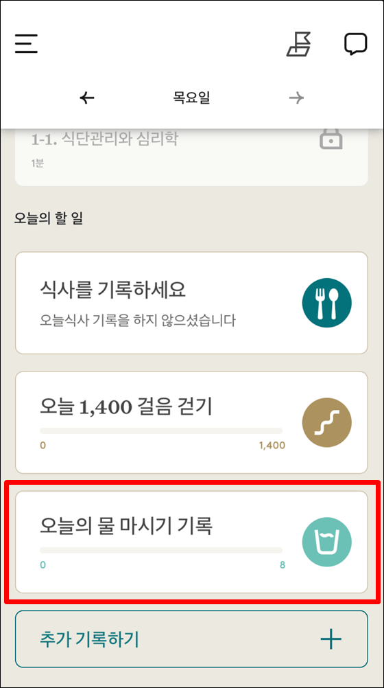 5. 이제부터는 홈 화면에서 오늘의 물 마시기 기록 카드를 클릭하여