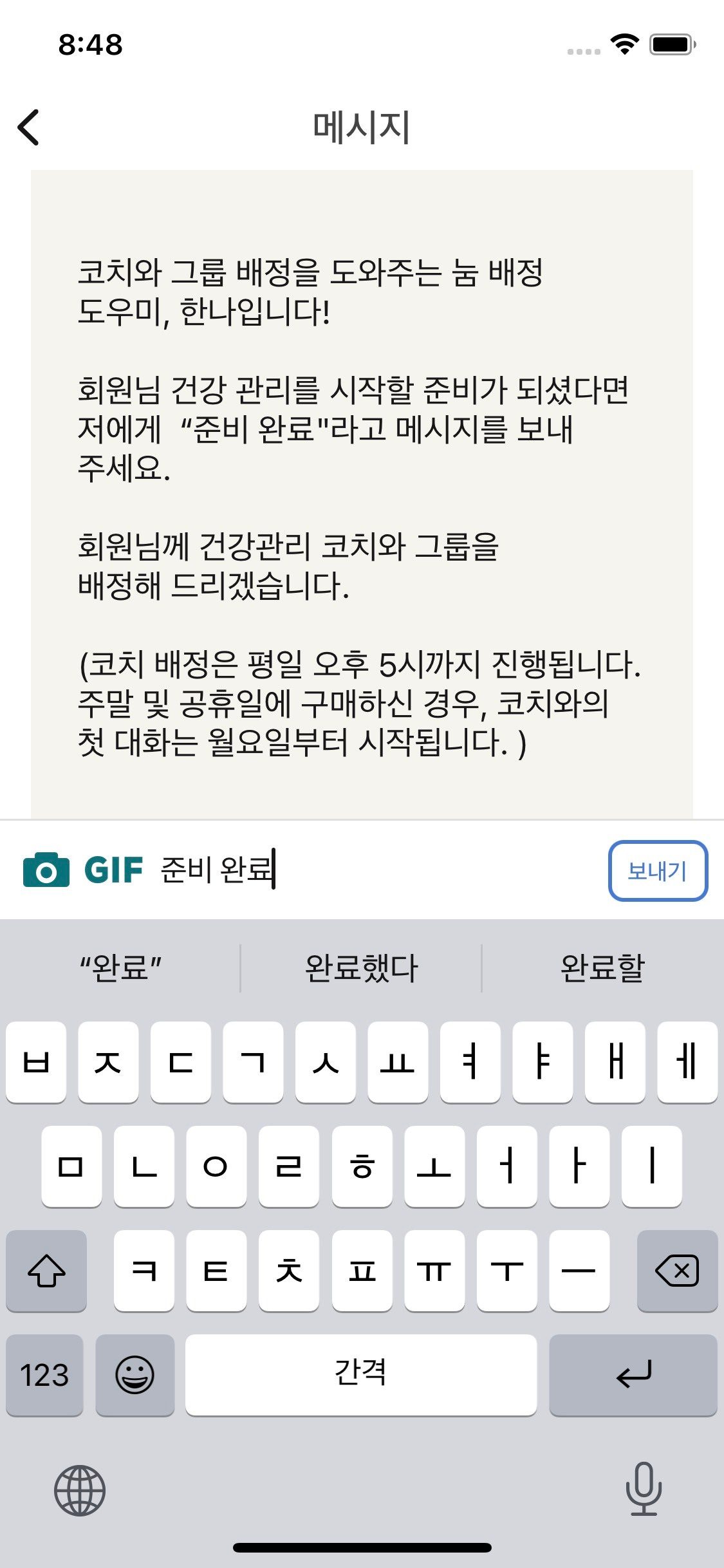메시지 창에 ‘준비완료’를 입력하시면 영업일 기준 1일 이내로 눔 코치가 배정됩니다!