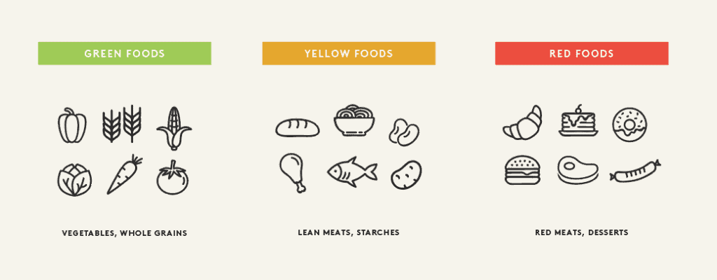 Remember, these recommendations are based on the Noom model of green foods (the lowest caloric density and the highest concentration of healthy nutrients), yellow foods (with mid-level caloric density and nutrition), and orange foods (highest caloric density/least healthy nutrients). But no food is “off limits.” Instead, buying more of the items on the right – and less of the ones on the left – will make everyone in your family eat just a little bit healthier.